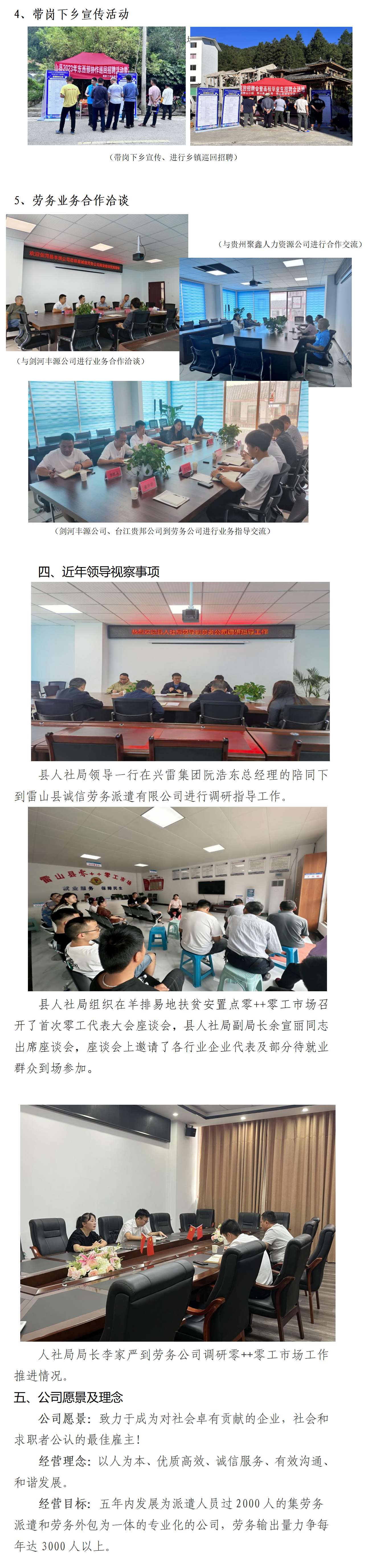 (三)人社就業(yè)服務(wù)項(xiàng)目情況:承接2022年以來,公司承接與縣人社局合作就業(yè)服務(wù)活動及公共就業(yè)服務(wù)項(xiàng)目,包括2022年就業(yè)援助百日攻堅(jiān)行動工作、離校高校畢業(yè)生就業(yè)服務(wù)活動、雷山縣季節(jié)性務(wù)工砍甘蔗有組織輸出工作、勞務(wù)品牌打造、勞務(wù)協(xié)作站點(diǎn)建設(shè)、易地搬遷安置點(diǎn)就業(yè)服務(wù)中心項(xiàng)目、零工市場項(xiàng)目、線上直播帶崗項(xiàng)目、東西部協(xié)作巡回招聘活動、雷山縣農(nóng)村外出務(wù)工人員返鄉(xiāng)返崗就業(yè)服務(wù)項(xiàng)目、雷山縣社區(qū)(村居)就業(yè)公共服務(wù)示范建設(shè)項(xiàng)目等。
