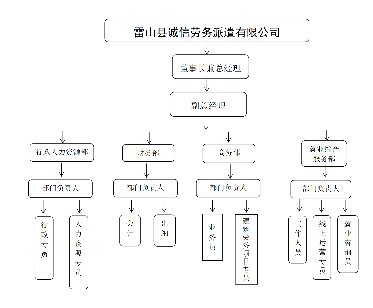 雷山縣誠信勞務(wù)派遣有限公司成立于2016年6月,系國有獨(dú)資公司。公司注冊資本為人民幣貳仟萬元(¥20000000.00),由雷山縣住房和城鄉(xiāng)建設(shè)局行使出資人職權(quán),貴州興雷投資開發(fā)(集團(tuán))有限責(zé)任公司代為管理。目前,公司在職人員17人,其中,正式職工9人,派遣制人員4人,見習(xí)生4人。公司下設(shè)行政人力資源部、財(cái)務(wù)部、商務(wù)部、就業(yè)綜合服務(wù)部四個部門。